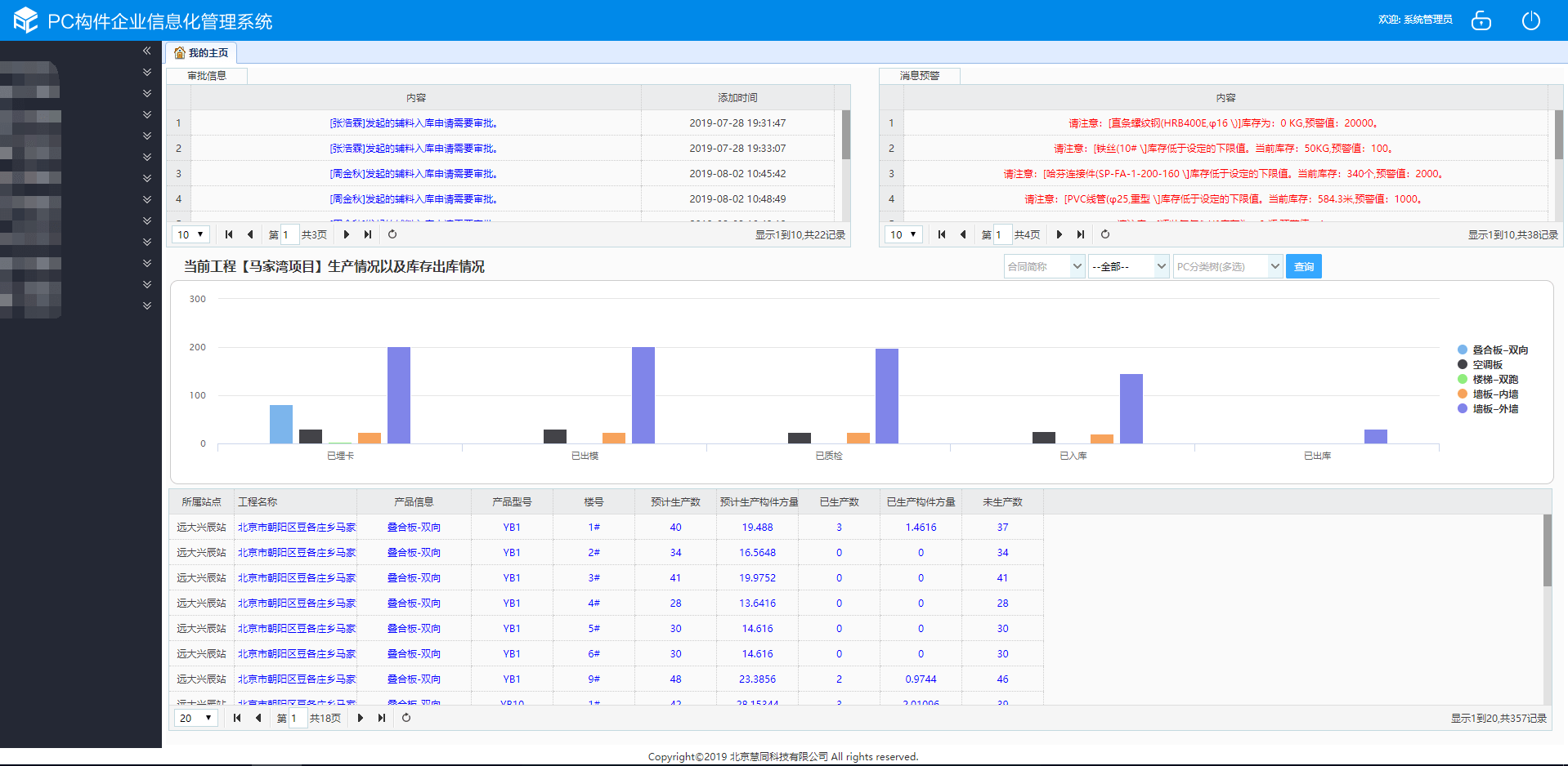 项目启动于2019年6月底,随即启动项目实施,实施功能范围包括了产品定义、销售管理、构件池管理(PC构件、钢筋量、构件配件量、构件关系)、生产管理(智能排产)、原材料采购、原材料仓储管理、辅料采购、辅料仓储管理、PC仓库管理、原材料试验管理、混凝土试验管理、构件试验管理、统计分析、平台管理、移动端智能物联、经营应收账款、原材料应付账款、辅料应付账款、成本统计(混凝土成本、钢筋成本、辅料成本、其它成本)等。经过了3个月的实施培训工作,上述功能均已正常使用,PC生产过程跟踪、工程进度跟踪、PC智能检索等亮点功能也已经正常使用。